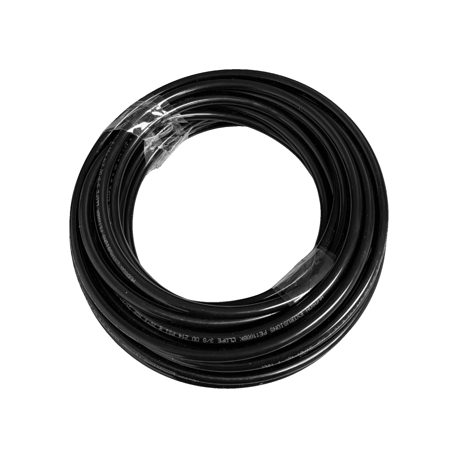 3/8″ black low‑density polyethylene tubing, sold by the foot. Flexible, chemical‑resistant line for dosing systems.