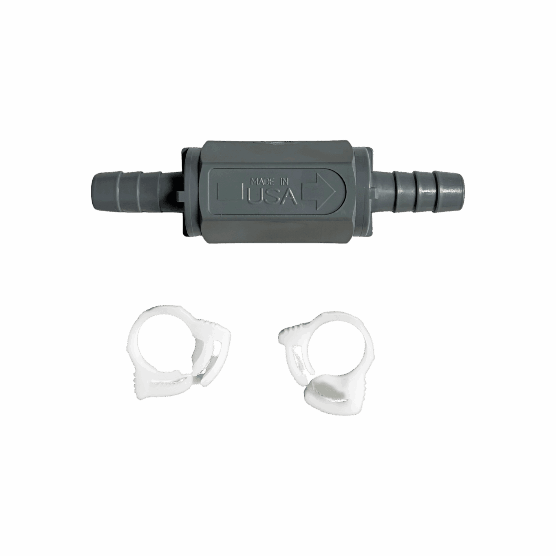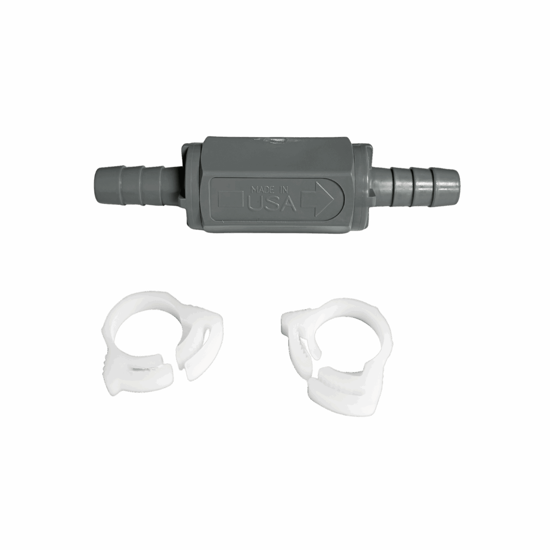 PVC in-line check valve to prevent backflow. Ensures consistent chemical dosing and protects pump system.