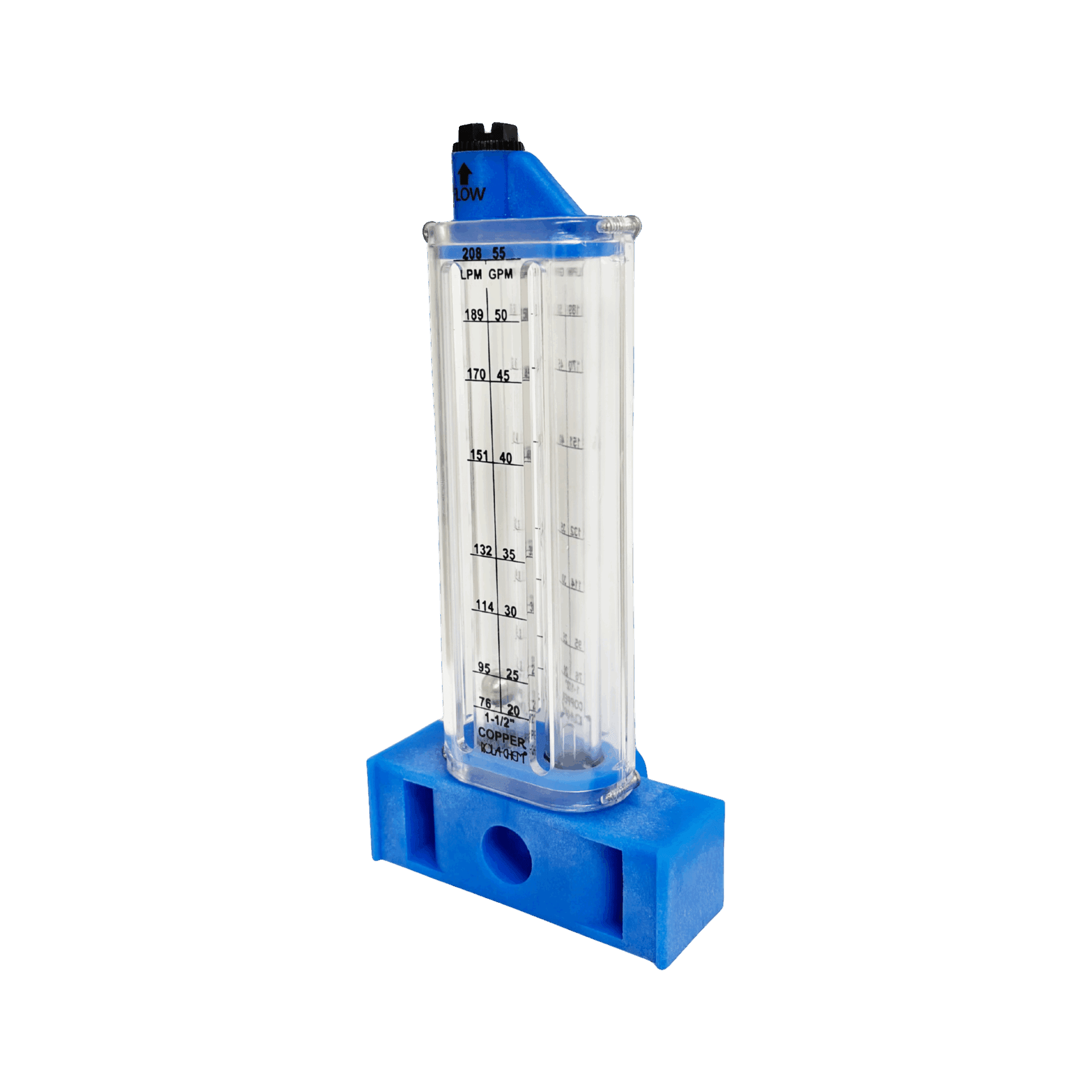 Vertical copper flowmeter for 1.5″ lines. Delivers accurate readings between 20–55 GPM with compact design.