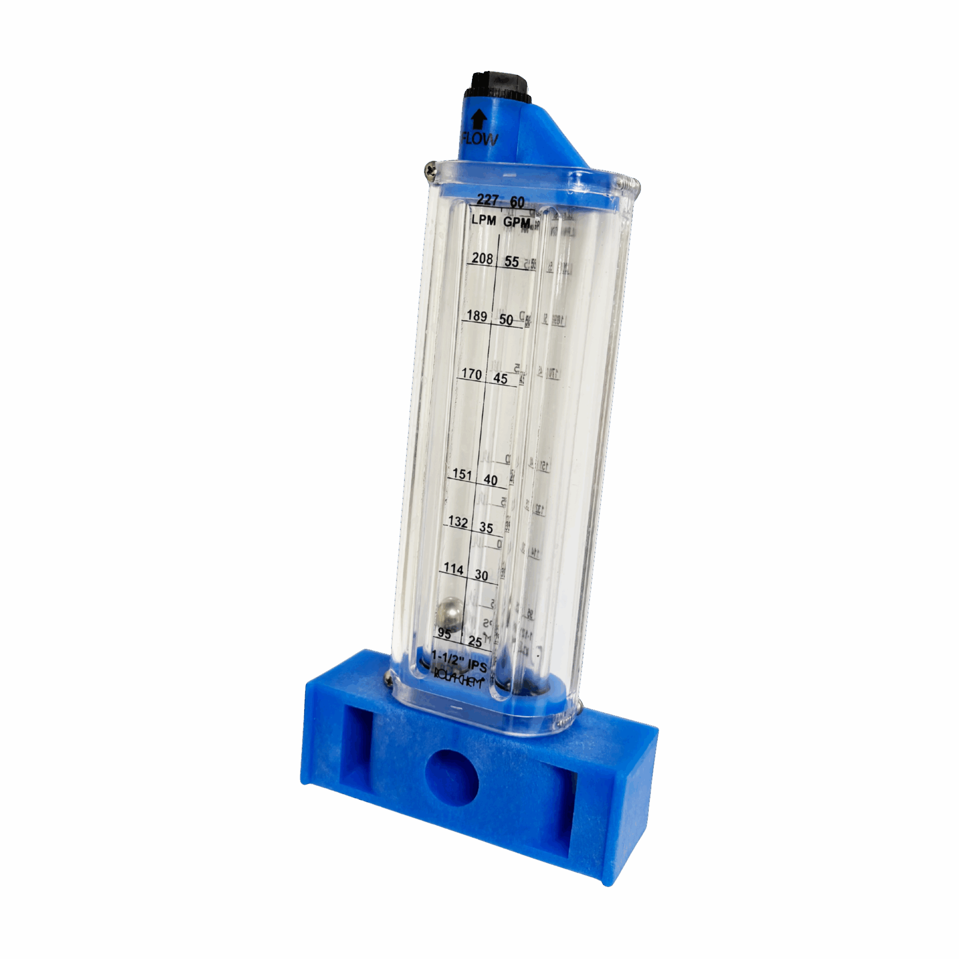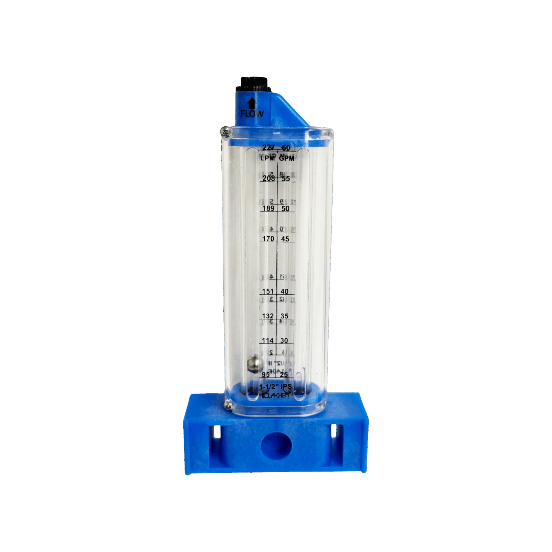Durable vertical-mount PVC flowmeter for 1.5″ lines. Provides accurate flow readings between 25–60 GPM.