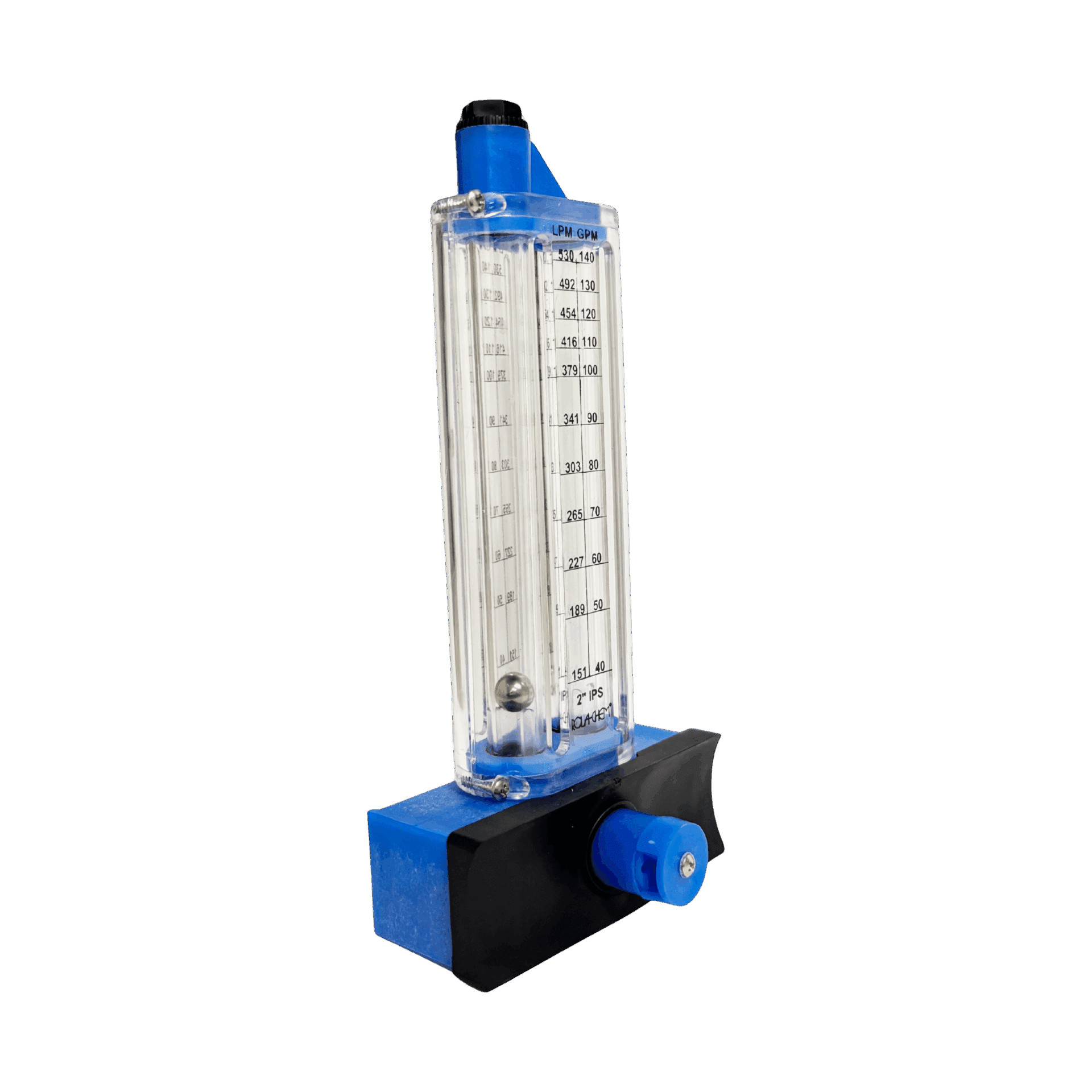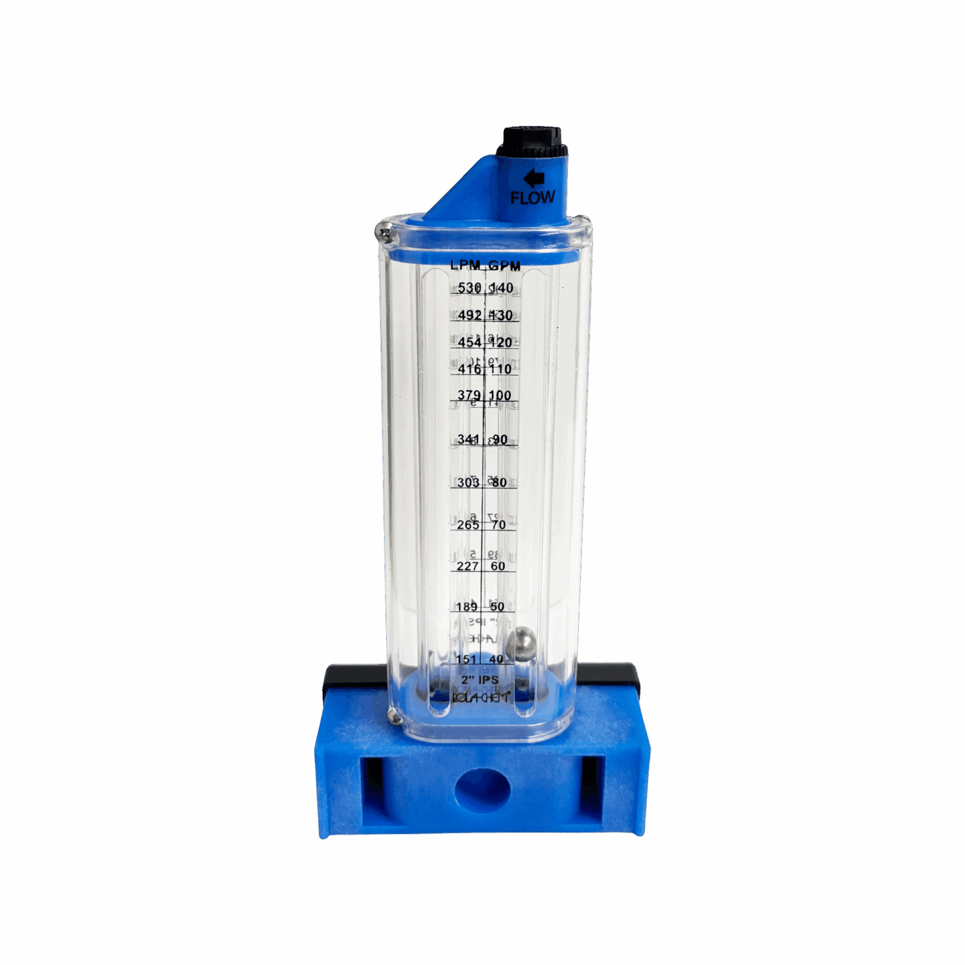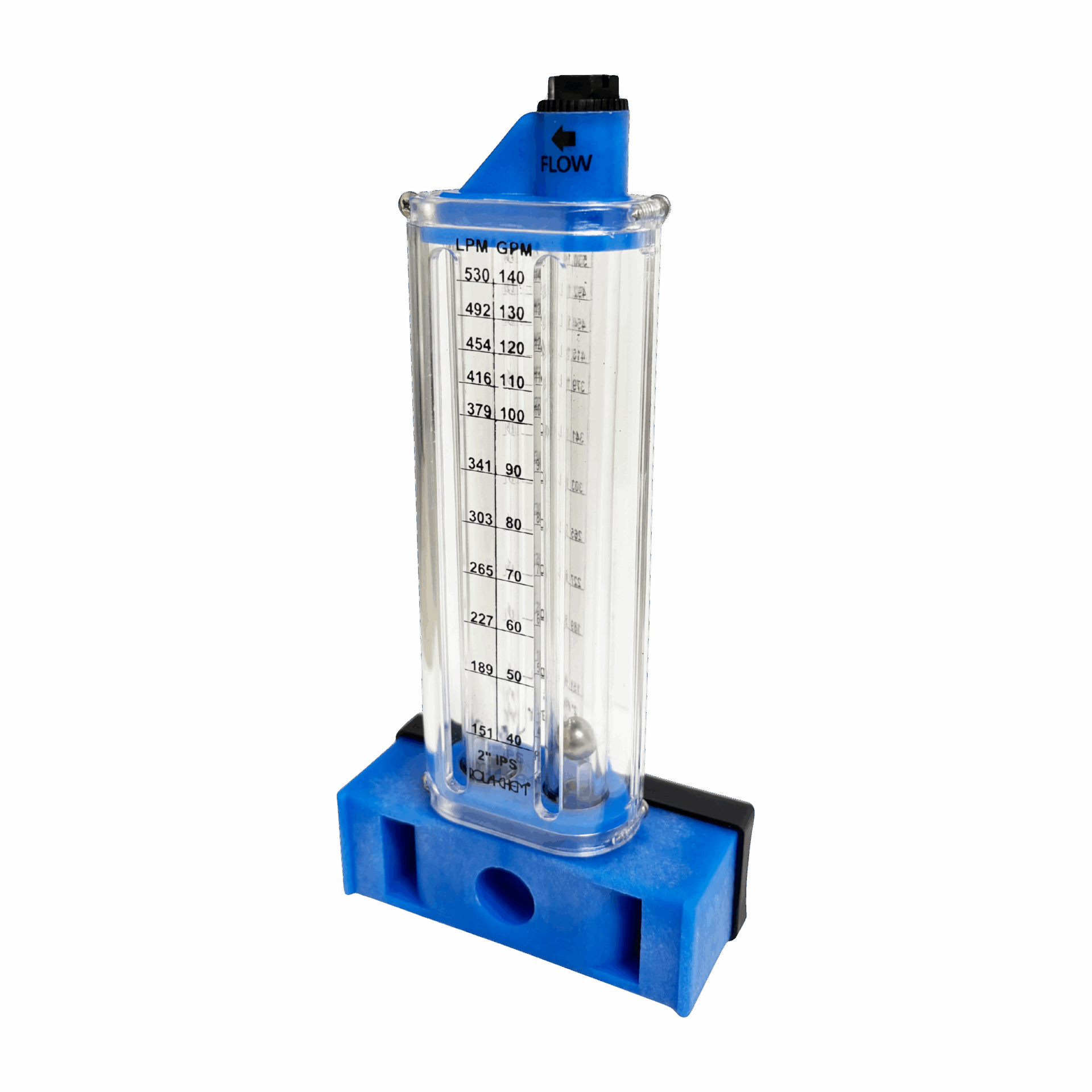 PVC side-mount flowmeter for 2″ lines. Accurately measures 40–140 GPM, built for long-lasting durability.