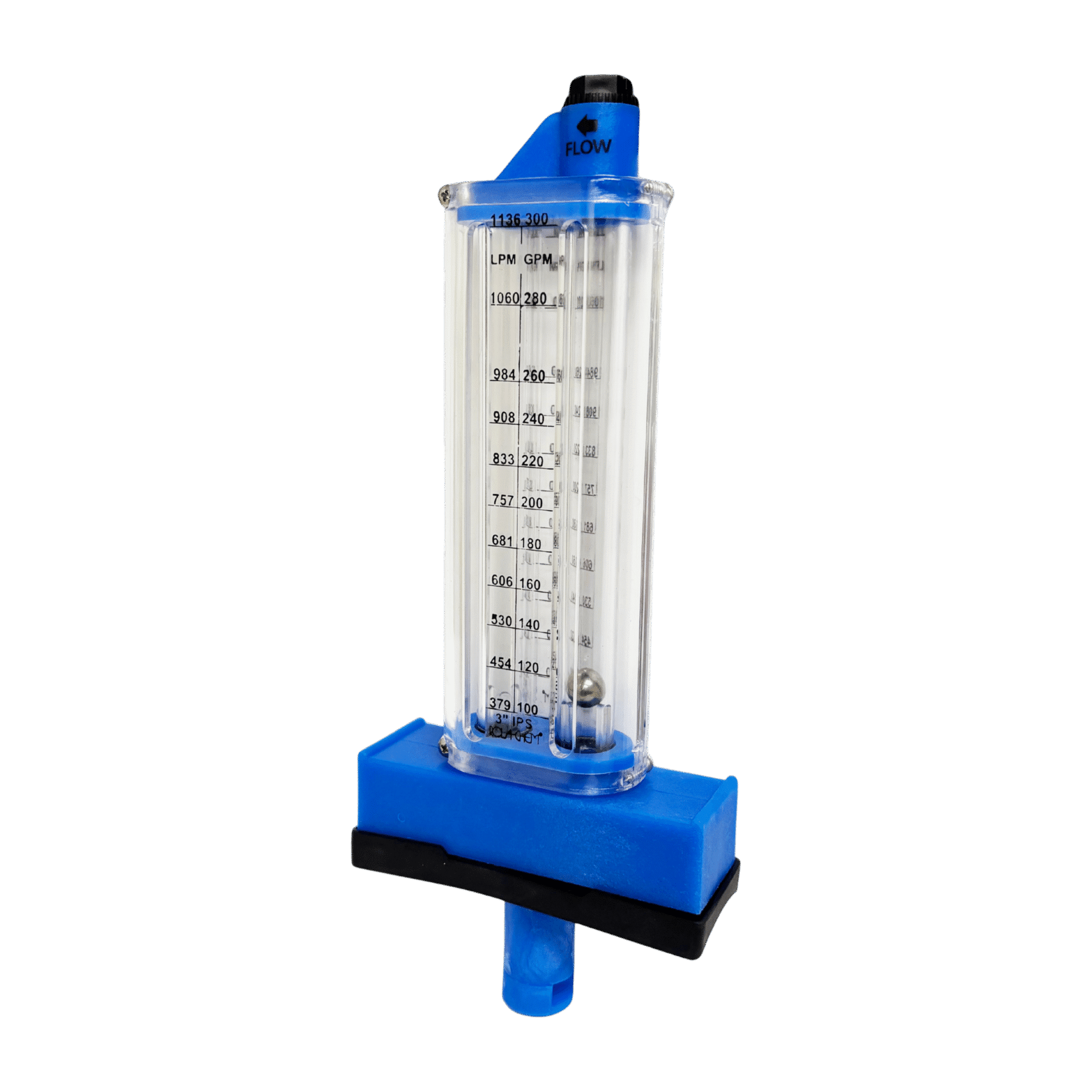 PVC top-mount flowmeter designed for 3″ systems. Displays reliable 100–300 GPM measurements.