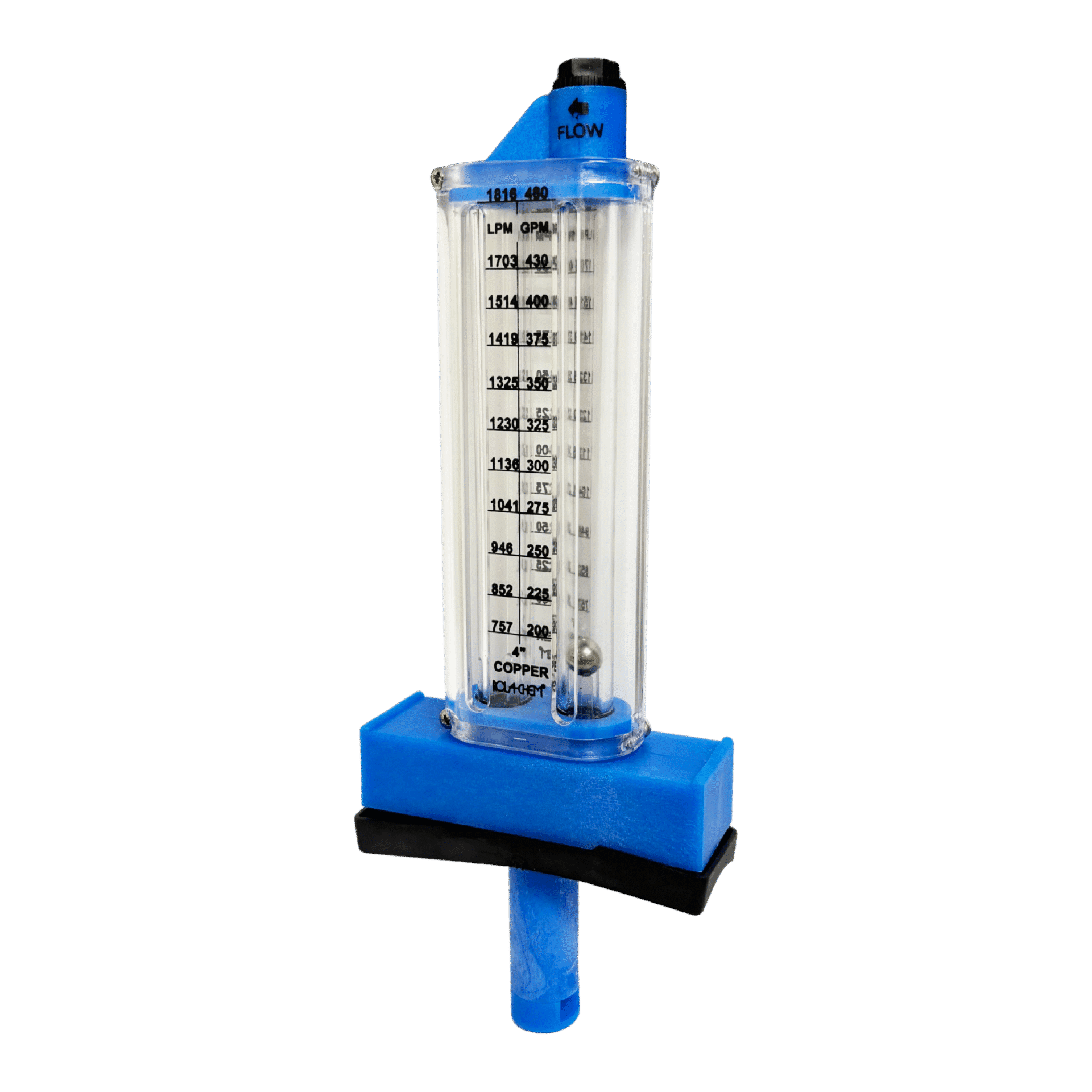Top-mounted 4″ copper flowmeter for large systems. Monitors flow rates from 200–480 GPM.