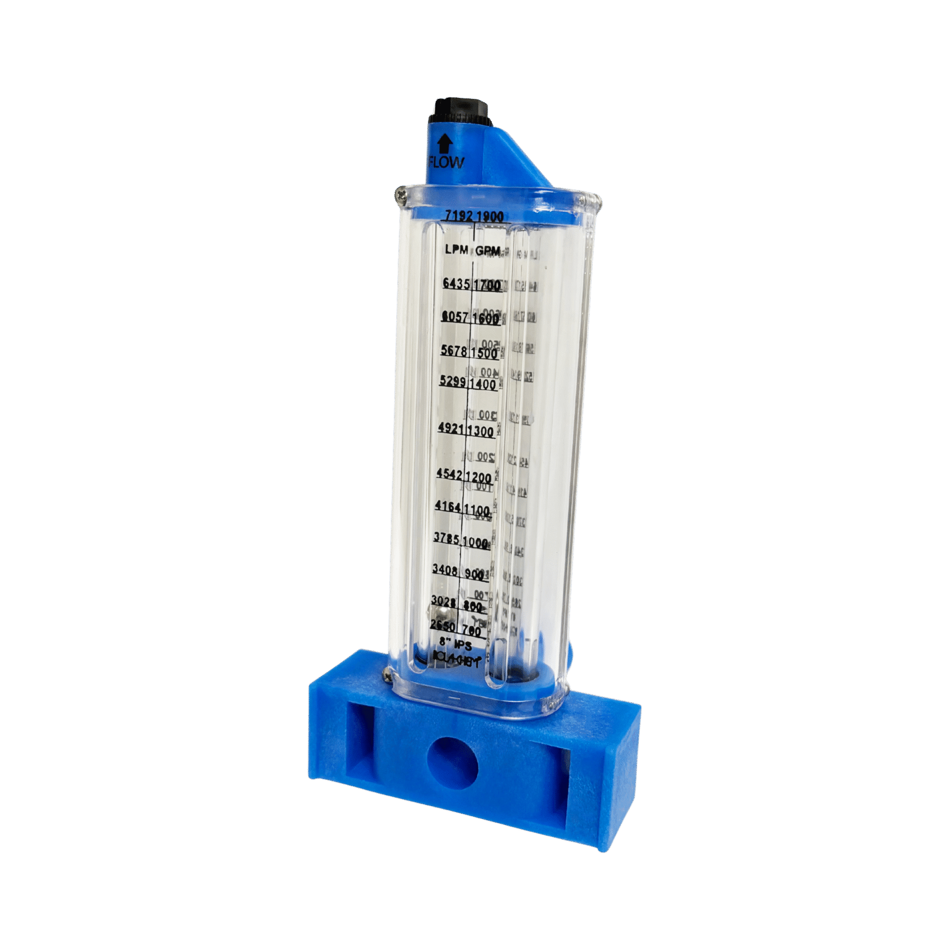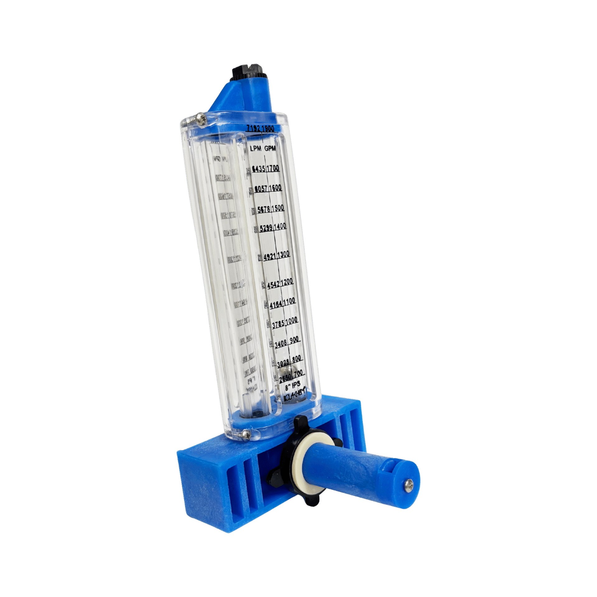 Large 8″ vertical PVC flowmeter. Delivers clear, accurate readings of 700–1900 GPM.
