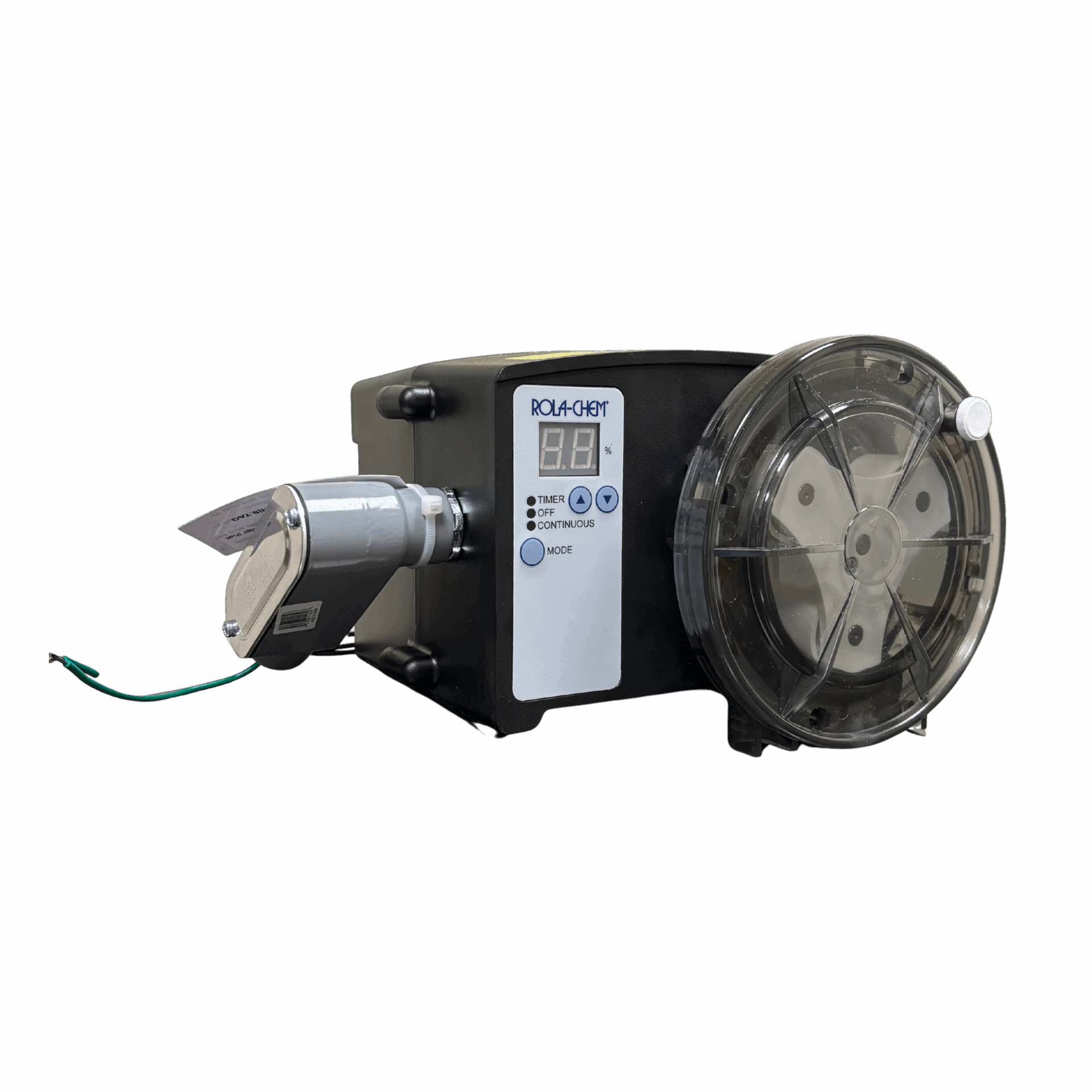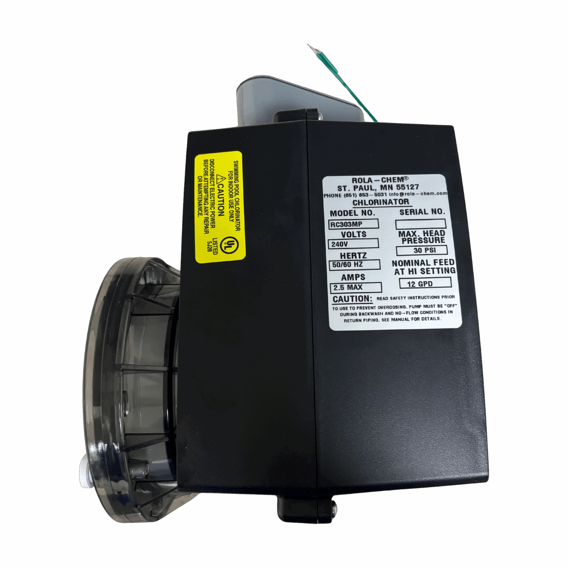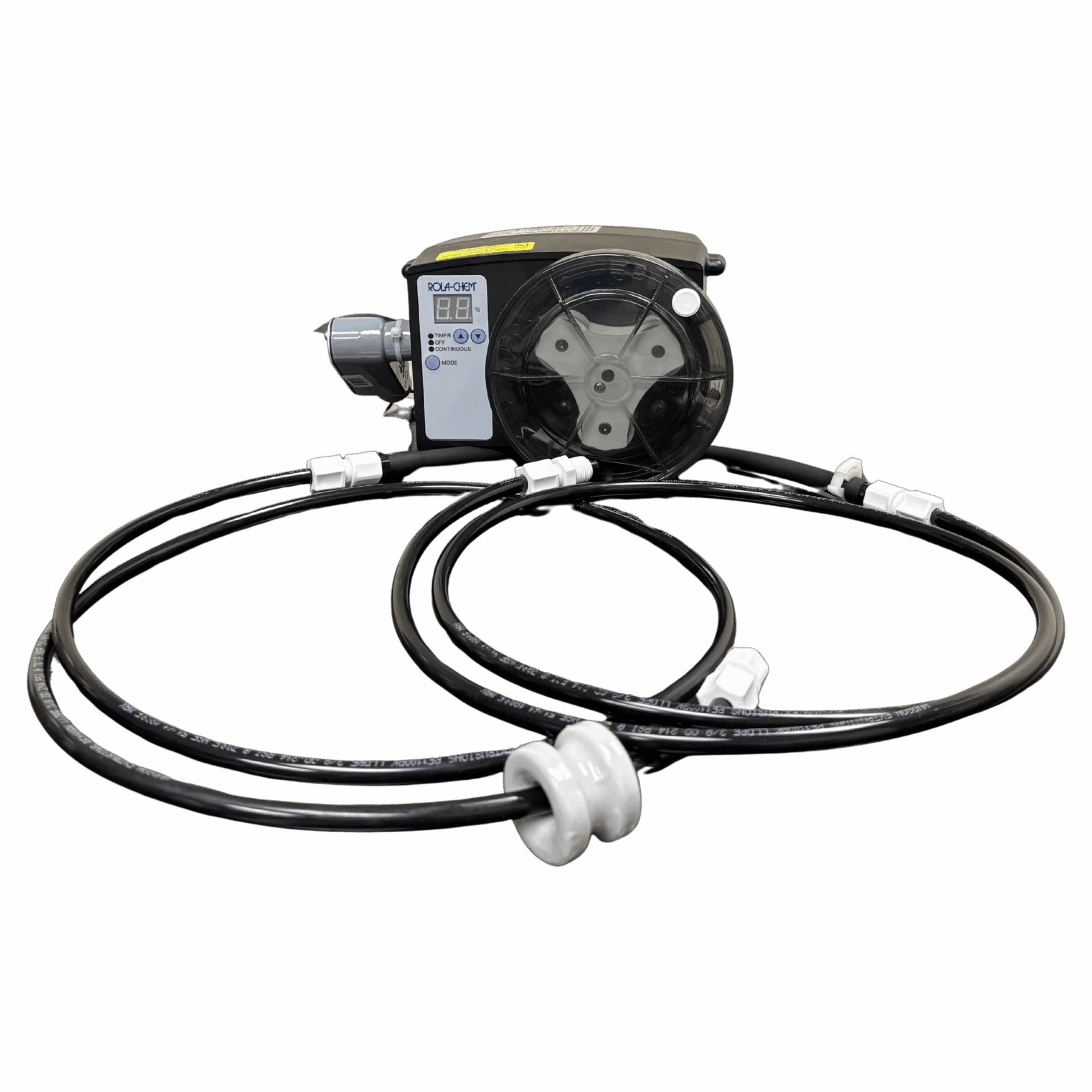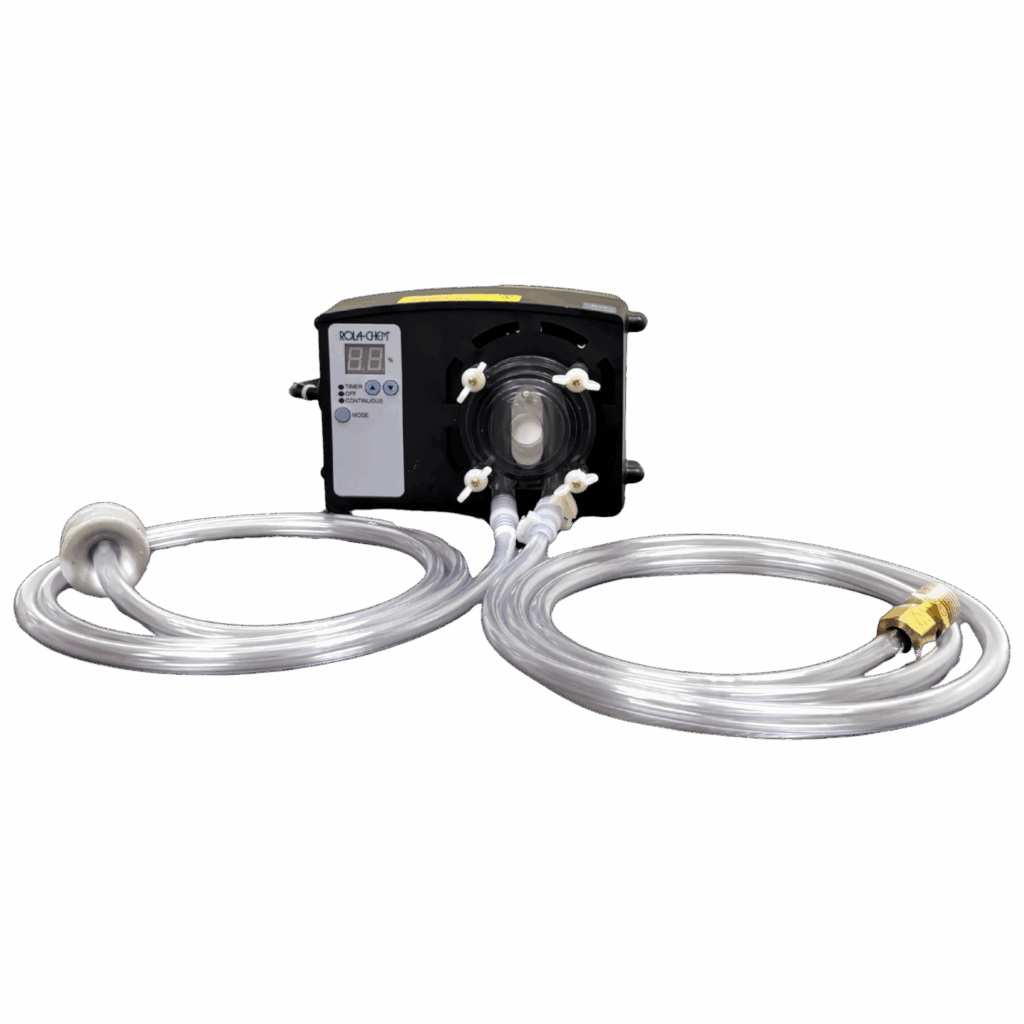12 GPD conduit-style pump with black Tygon/vinyl tubing for added durability. 240V power ensures steady, reliable dosing performance for commercial pools and spas.