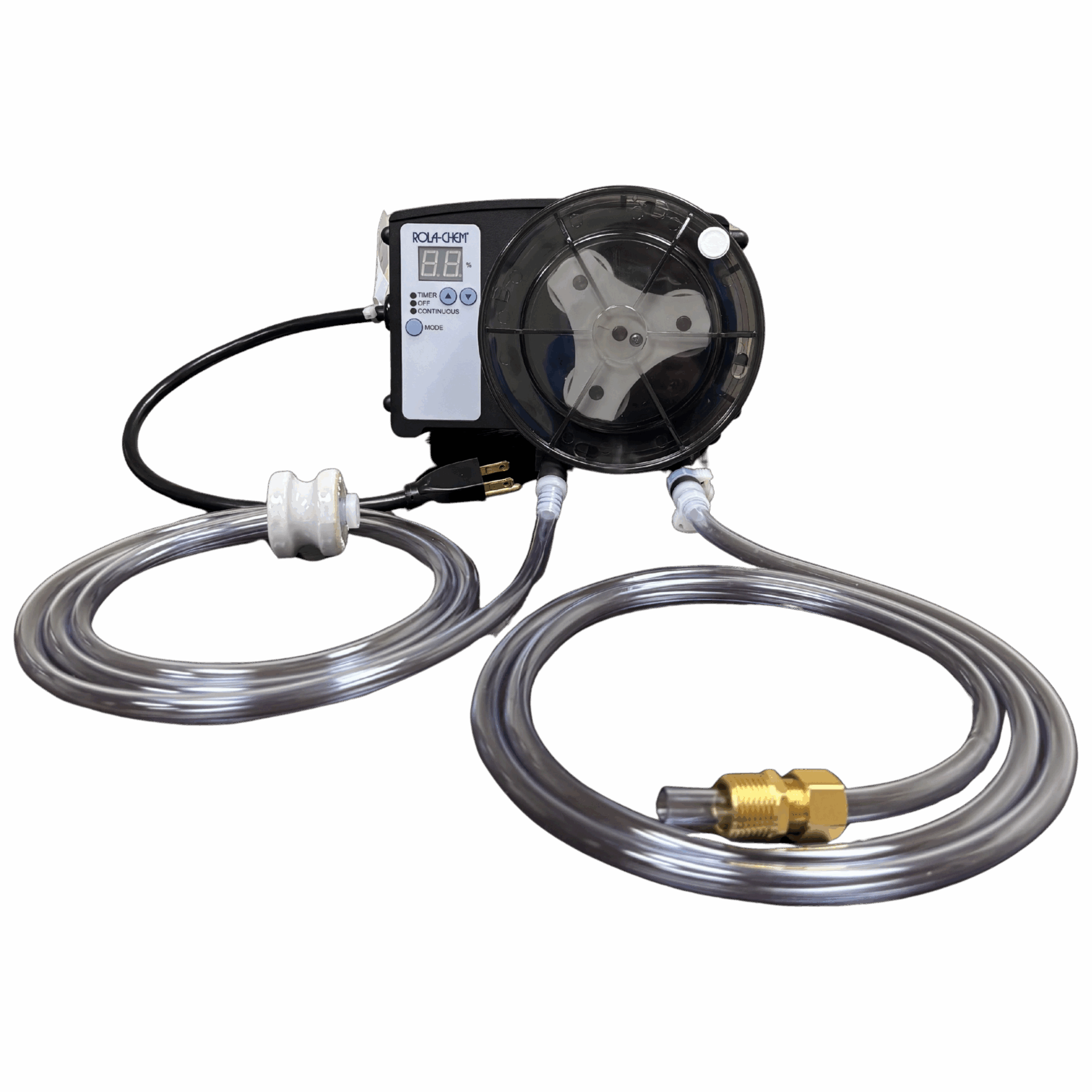 Heavy-duty 38 GPD pump with black Tygon/vinyl tubing for chemical resistance. 120V corded design ensures easy setup and reliable performance.