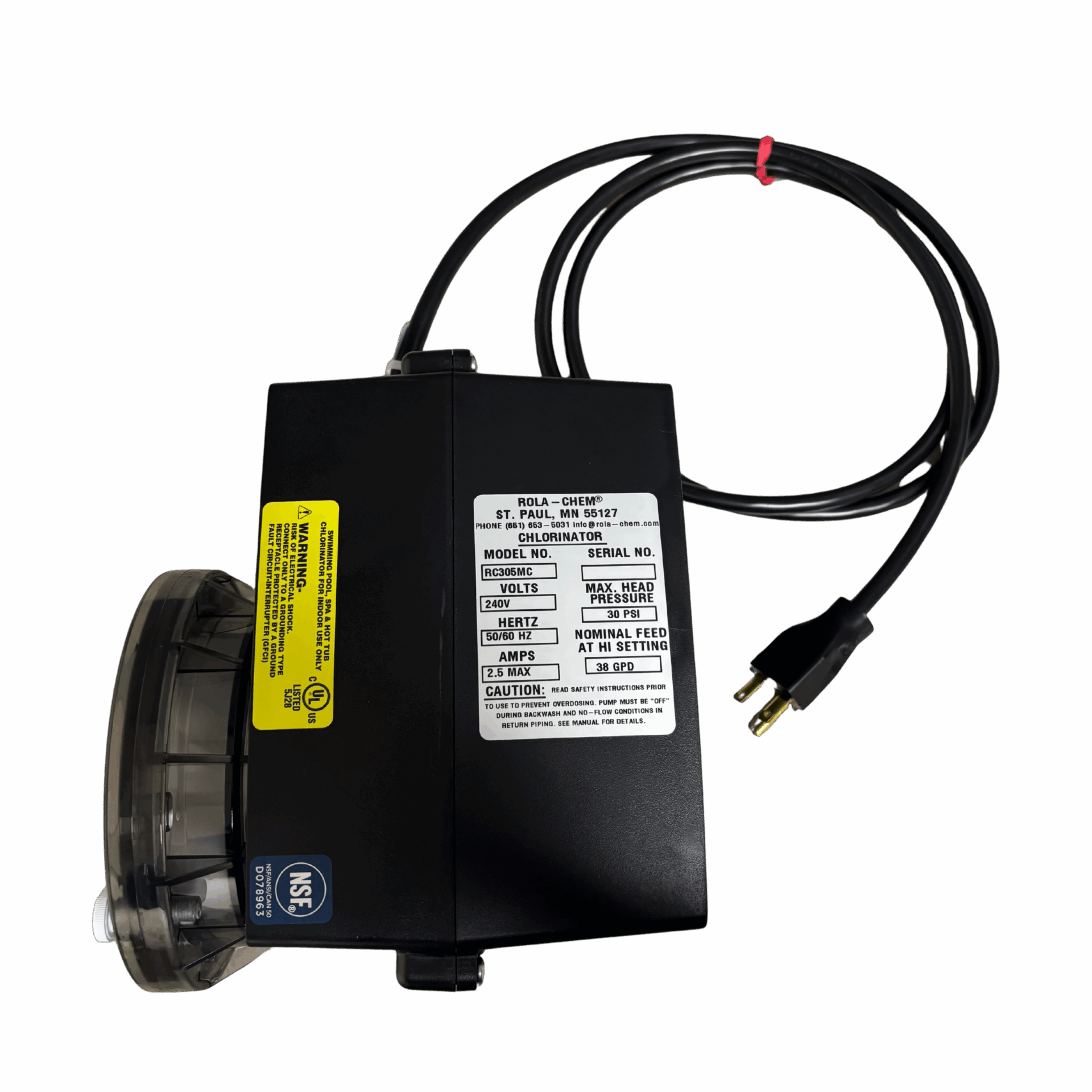 38 GPD chemical dosing pump powered by 240V cord. Provides high-volume accuracy and reliable operation for pools requiring greater capacity.