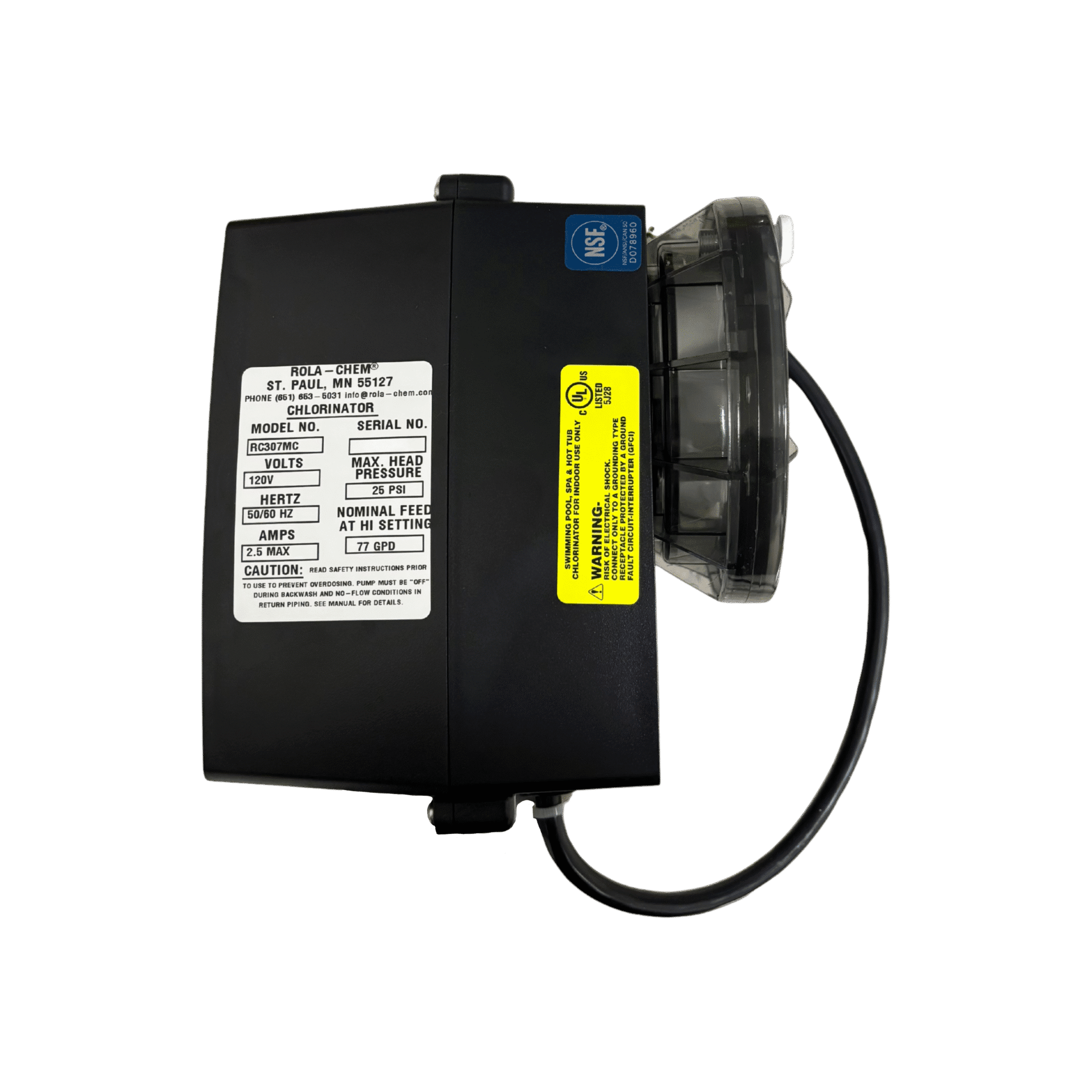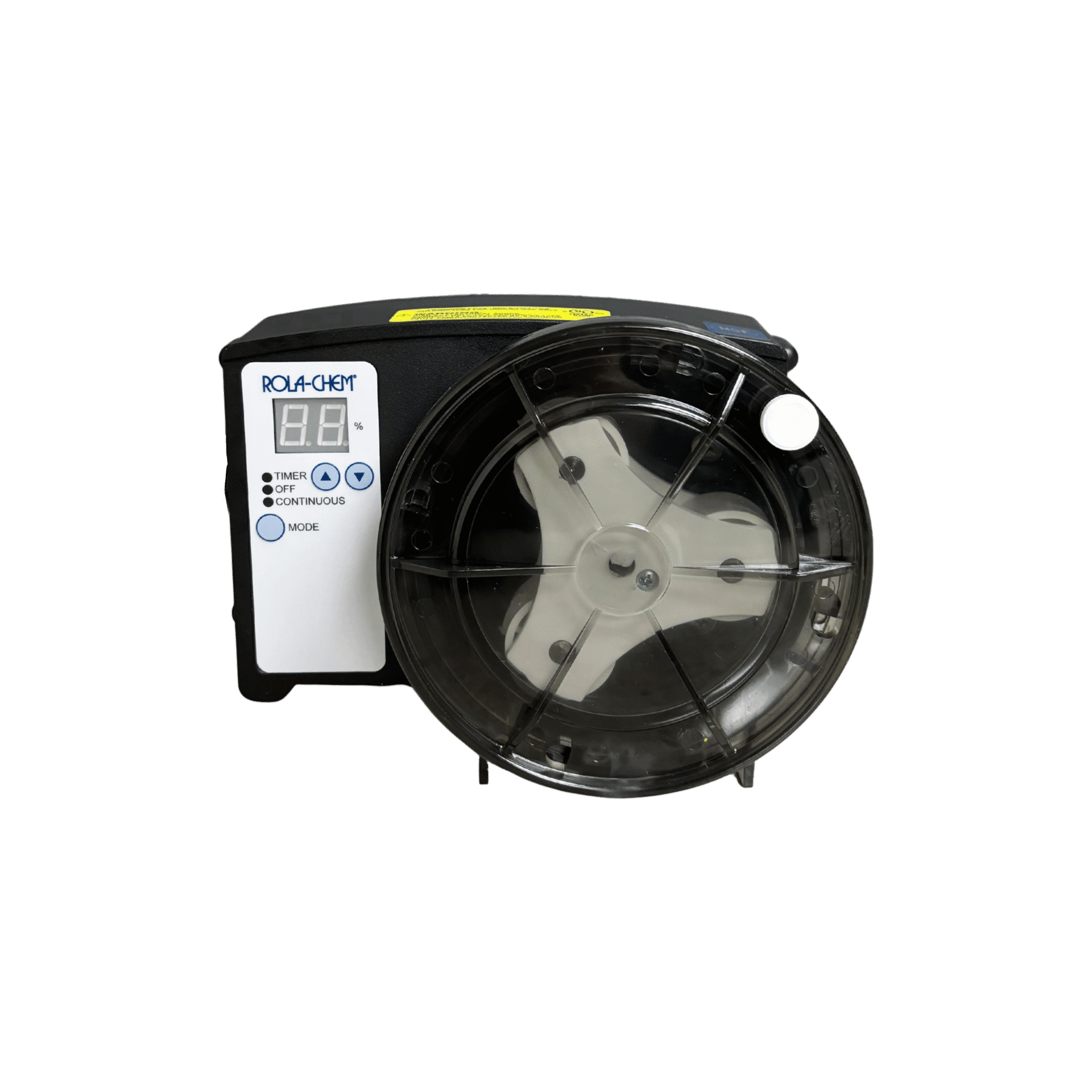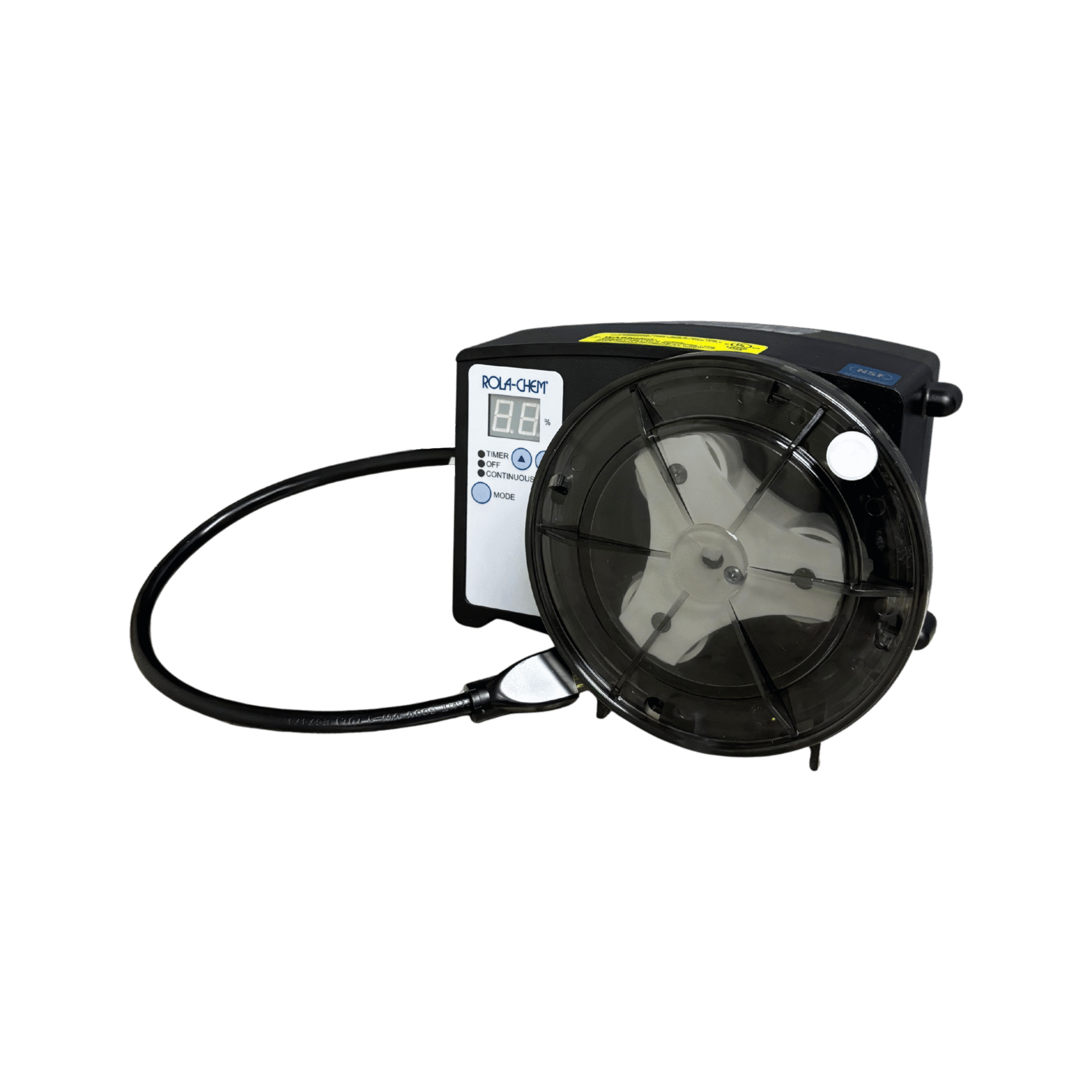 High-capacity 77 GPD pump with short cord and black Tygon/vinyl tubing. Compact yet powerful solution for big pool chemical maintenance.