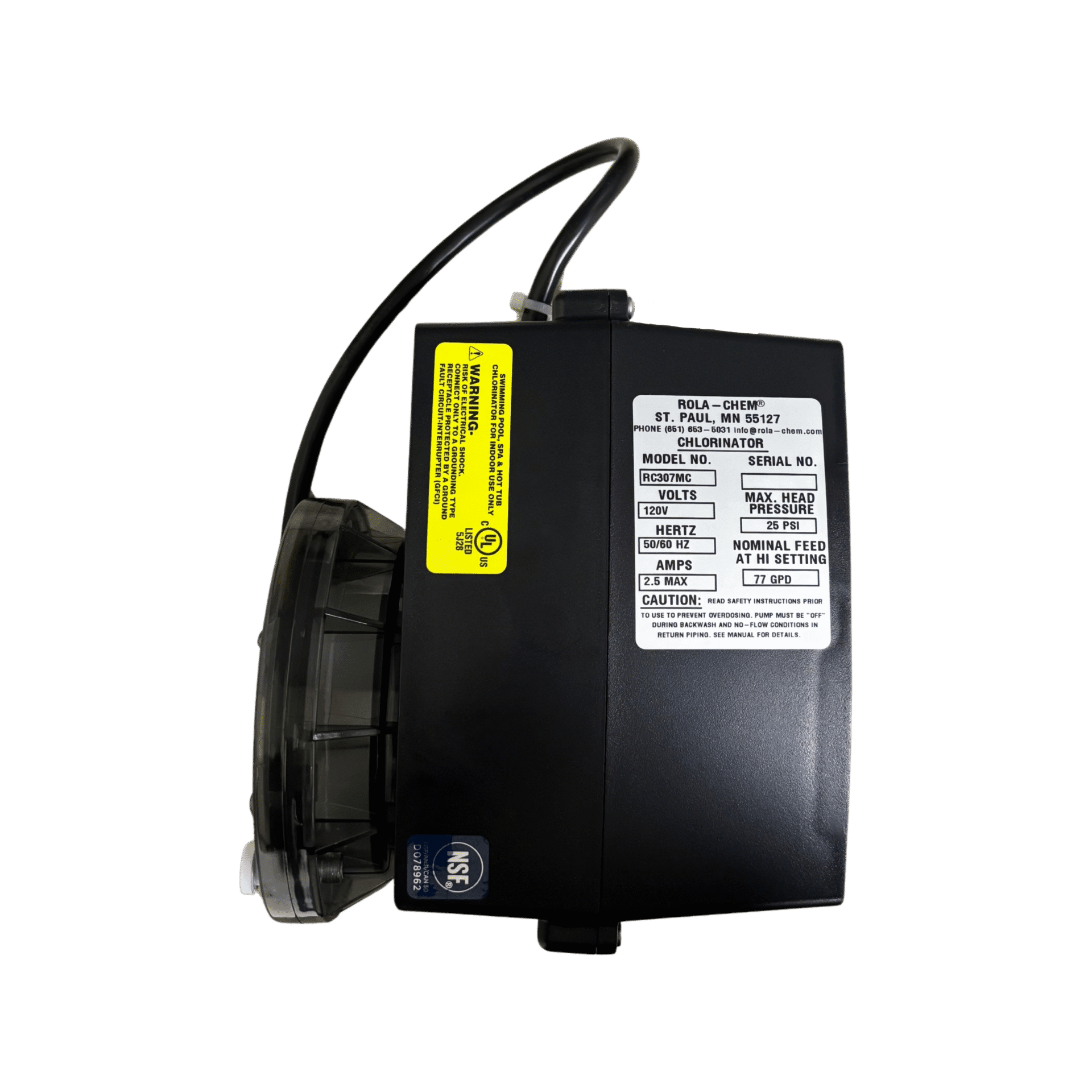 77 GPD dosing pump with short cord for compact spaces. Provides dependable, accurate chemical delivery for larger water treatment needs.