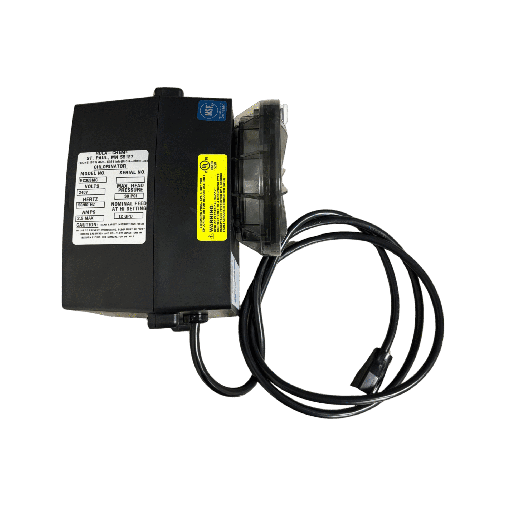 Efficient 12 GPD dosing pump with 240V power connection. Provides dependable chemical delivery for consistent pool water quality in higher-demand systems.