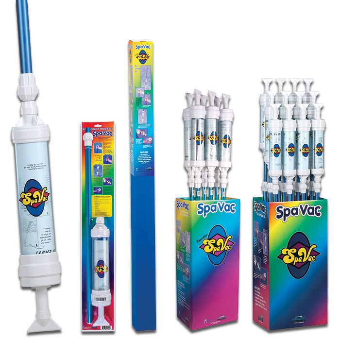 Bulk 12-pack of Spa Vac units in display case. Reliable, simple tool for keeping spas and hot tubs clean.